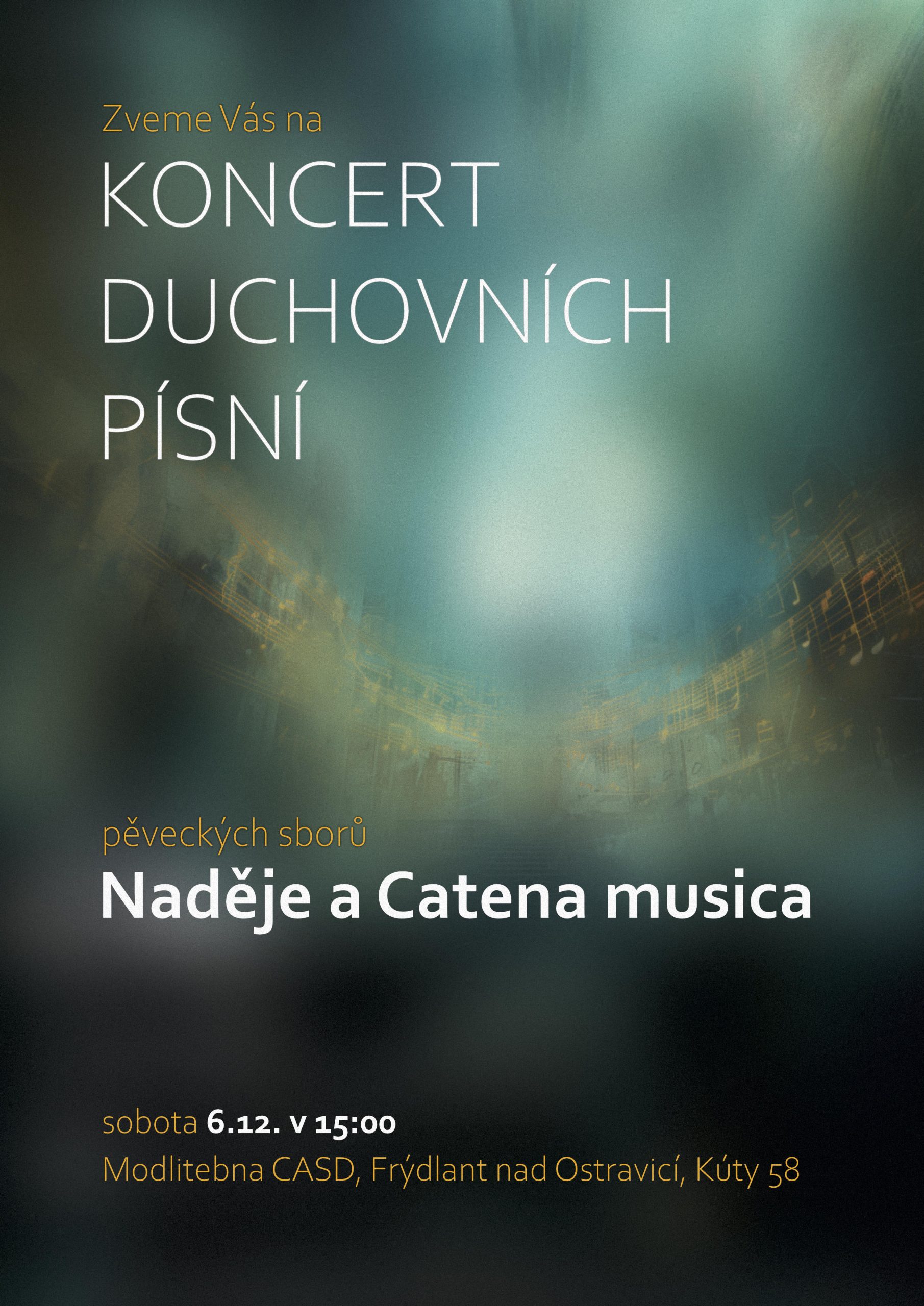 Zveme Vás na koncert duchovních písní pěveckých sborů Naděje a Catena Musica, který se bude konat v sobotu 6. 12. 2025 od 15:00. Budeme se na Vás těšit.